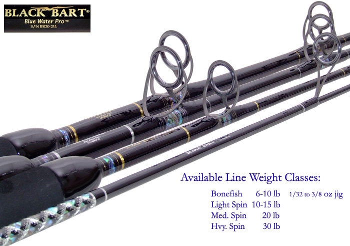 My 20 to 30 lb spinning rods are typical of all Black Bart products made for the descerning fisherman. They are part of my personalized rod collection each "Dangerously Perfect" and the very ultimate in design and function.