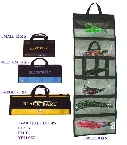 Black Bart Embroidered lure bags made in the USA from the finest of materials. Black fabric with colored mesh back with clear view inside pockets and heavy duty carrying handle. Extra large pockets for rigging and lure storage. Self draining with 6 over sized pockets. Available colors: Black, Blue and Yellow.