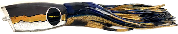 Brazilliano custom gold-silver-black yellowfin head. Skirted Yellowfin Tuna over Silver Gold Black. (YFT/SGB)