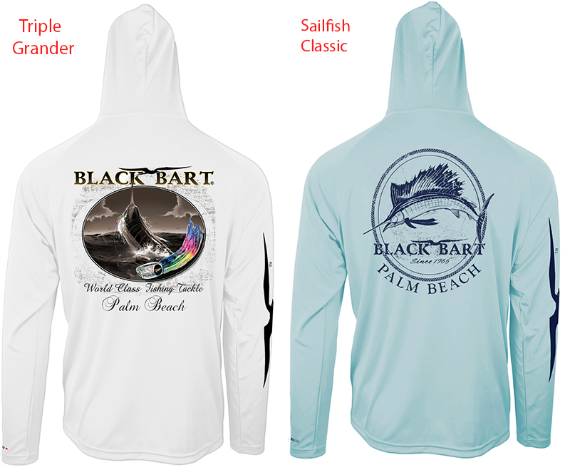 High density microfiber technology fabric engineered to provide UPF 50+ protection, blocks 97% UVA & UVB rays. Dye-sub printed, choose Bart "Triple Grander" or "Sailfish Classic" designs with Bart logo on the front and frigate bird logo on the right sleeve. Lightweight and comfortable once you try them it's hard to wear anything else.
